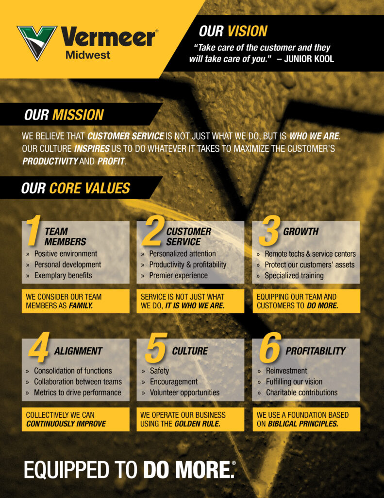 Go the extra mile. Work the extra hours. Get your boots dirty on the jobsite. Do whatever it takes to take care of the customer. At Vermeer Midwest, this isn’t a banner on the wall or some statement in a business plan. It’s simply how business is done.