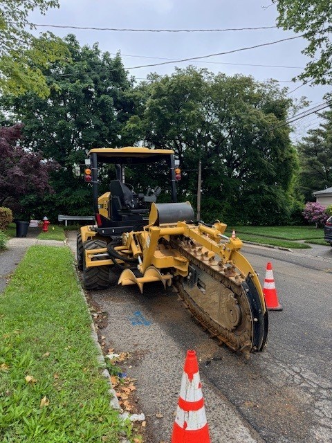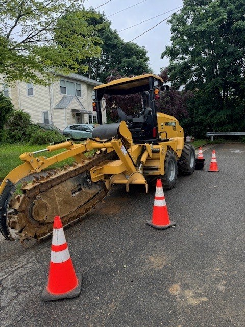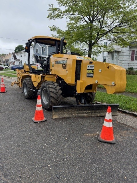 rubber tire w/ foam, tilt option, open rops, highway safety and work lights, front weight kit, backfill blade, sliding offset trencher w/ 48" boom and 8" wide rotary chain. Hours are approx.